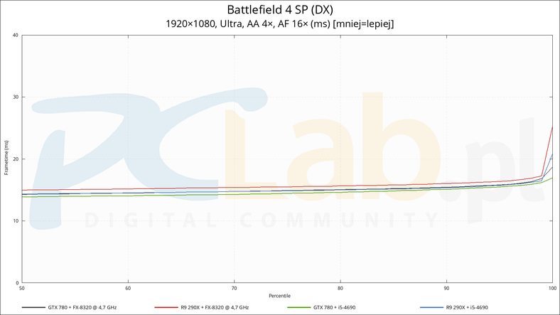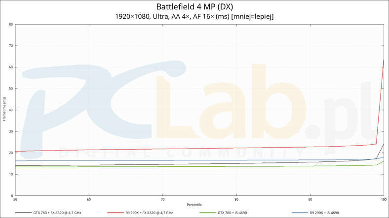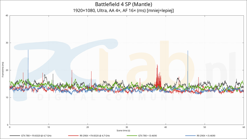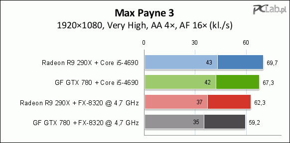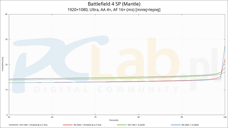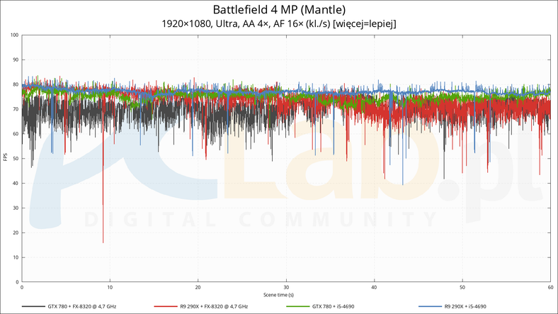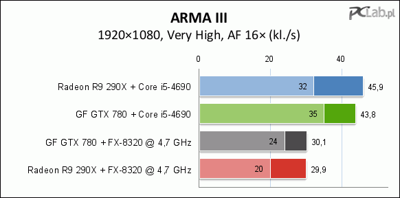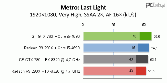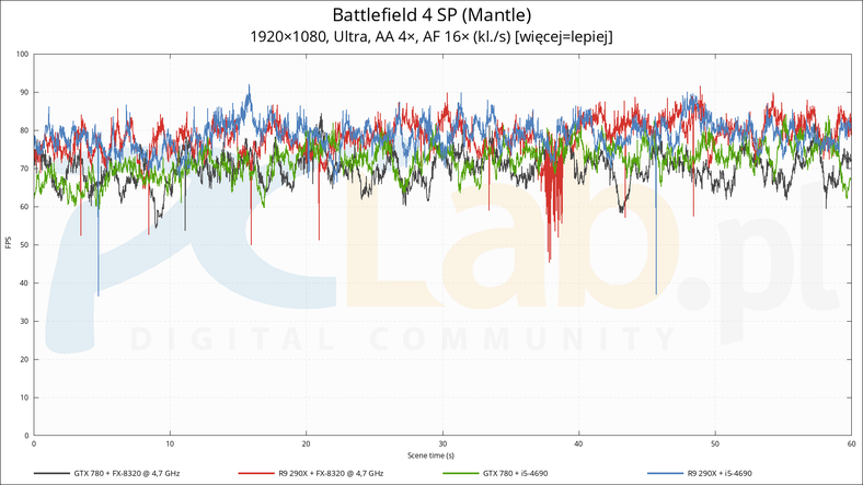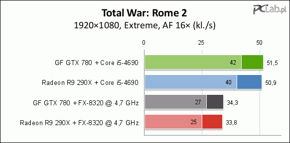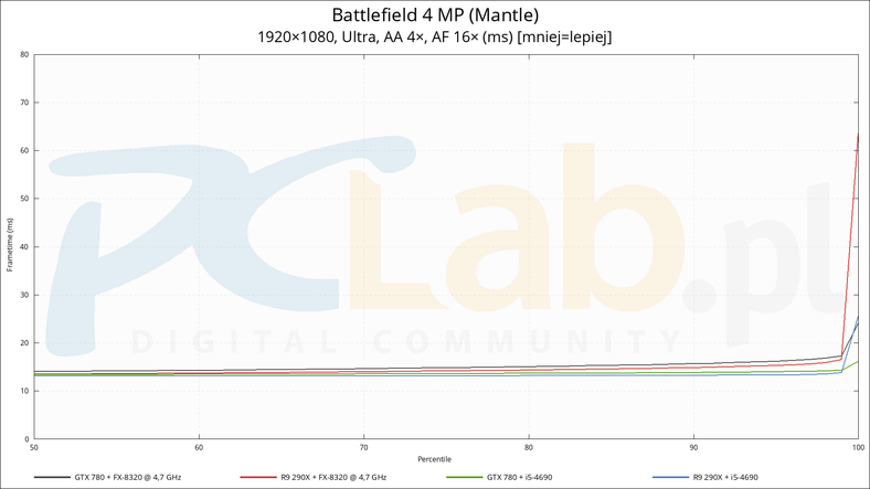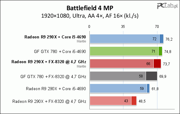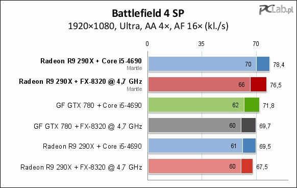 Radeon R9 290X w trybie Mantle oferuje wysoką wydajność. Konkurencją może być jedynie Core i5 + GeForce GTX 780, który uzyskuje podobną wydajność w DirectX (optymalizacje wprowadzone przez Nvidię w ciągu ostatnich miesięcy pozwoliły zniwelować większość przewagi Mantle). Radeon bez pomocy nowego API AMD jest wyraźnie słabszy. Na konfiguracjach z procesorem AMD FX stabilność animacji jest zauważalnie gorsza.