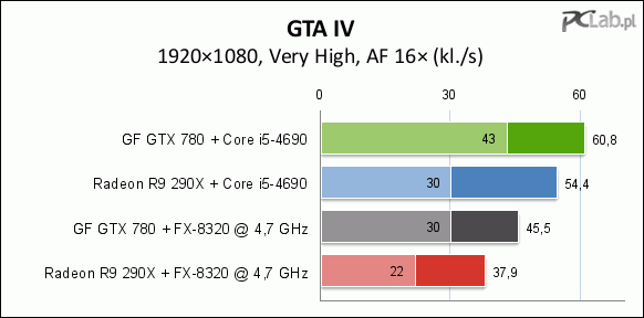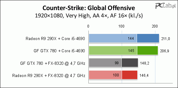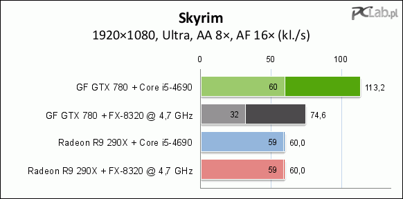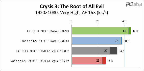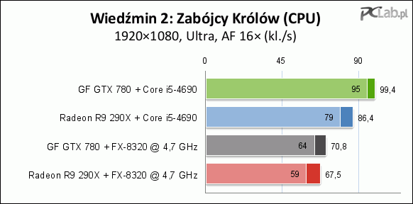 Końcowy wniosek jest więc taki sam jak w poprzednich artykułach: im szybszy procesor (najlepiej o wydajnym pojedynczym wątku), tym karty AMD Radeon wypadają lepiej. Jak widać, różnica występuje już pomiędzy standardowo taktowanym Core i5-4690 a Core i7 @ 4,5–4,7 GHz. Trzeba przy tym pamiętać, że Core i5-4690 to obecnie najmocniejszy procesor do gier, jaki można kupić w rozsądnej cenie (Core i7 zapewnia tylko nieznacznie lepszą wydajność, a kosztuje dużo więcej). Nawet po użyciu tak szybkiego CPU teoretycznie porównywalna z Radeonem karta Nvidii nie tylko skutecznie z nim rywalizuje, ale też często go wyprzedza (średnio GTX 780 okazał się szybszy od Radeona R9 290X o 10%). Jeśli masz któryś z procesorów AMD FX, to tym bardziej powinieneś kupić kartę Nvidii. AMD musi popracować nad swoimi sterownikami, by te lepiej wykorzystywały nowoczesne, często wielowątkowe CPU. Wyniki testów kart graficznych we współpracy z najszybszymi procesorami w momentach zależnych wyłącznie od wydajności w przetwarzaniu obrazu to obecnie jedynie ciekawostka, bo nie mają przełożenia na faktyczne doznania w typowej rozgrywce.