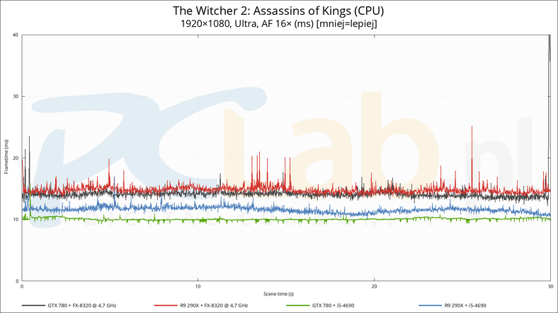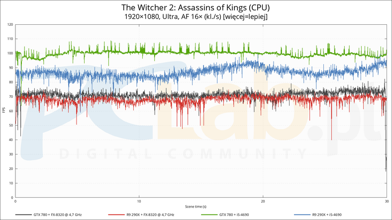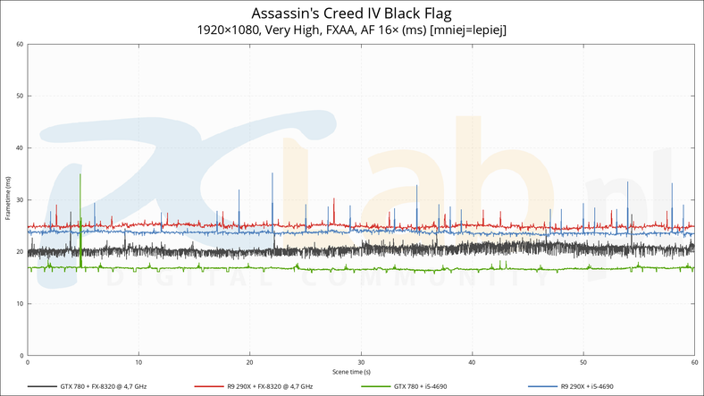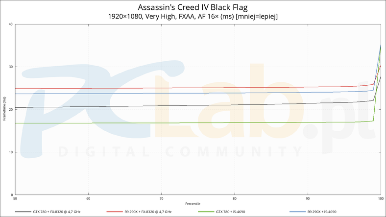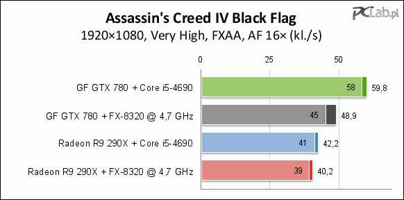 Seria Assassin's Creed działa wyraźnie gorzej na kartach AMD Radeon, co potwierdza powyższy wykres. Zestawy wykorzystujące GeForce'a GTX 780 wypadają po prostu lepiej. Jedynie na konfiguracji Core i5 + GeForce GTX 780 możemy liczyć na stałe 60 kl./s.