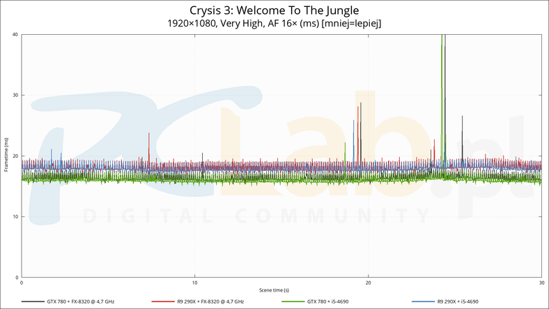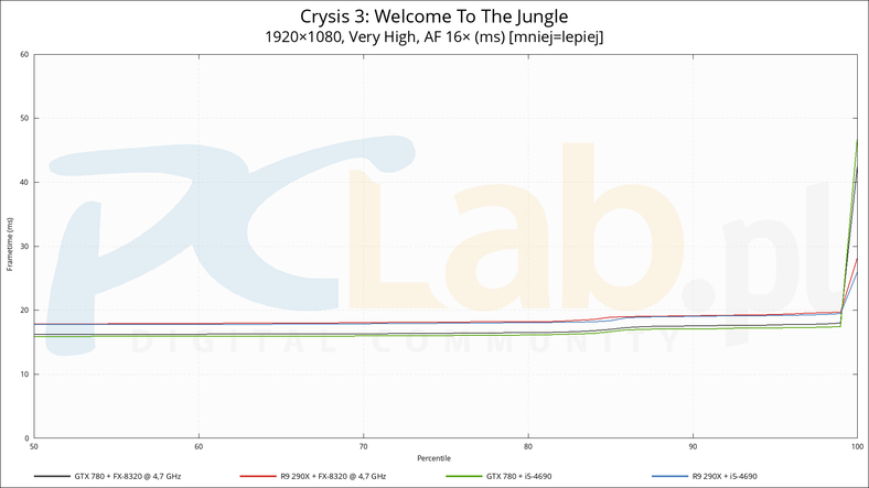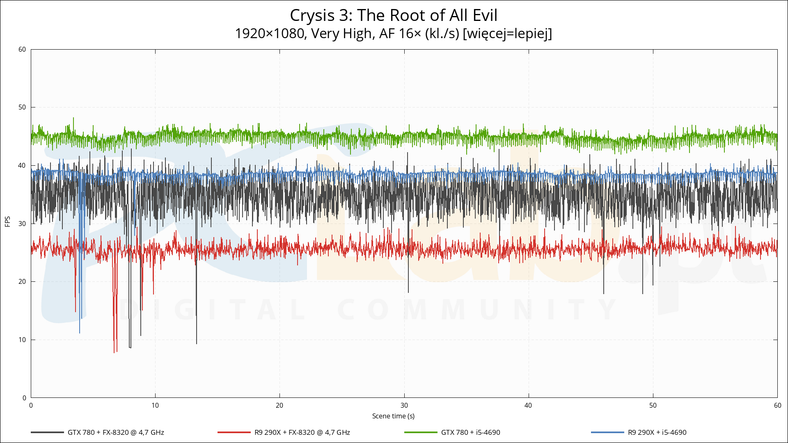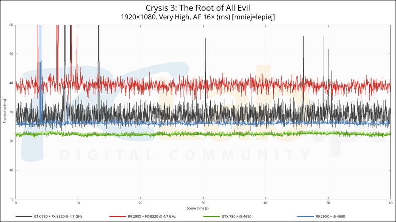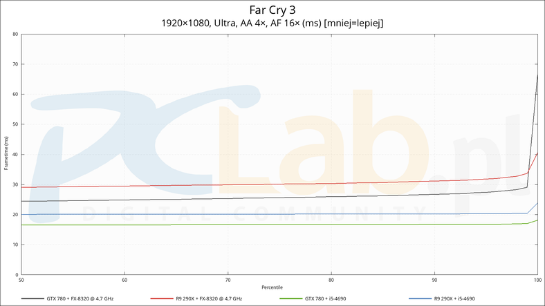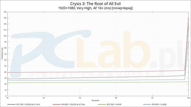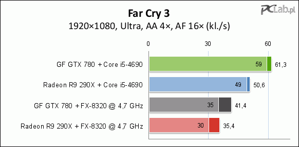 Pierwsze miejsce testowe Crysisa 3 (bardziej obciążające procesor) pokazuje jak dużą przewagę ma domyślnie taktowany Core i5 nad procesorami AMD FX. GeForce GTX 780 oferuje w tej grze sporo wyższą wydajność.