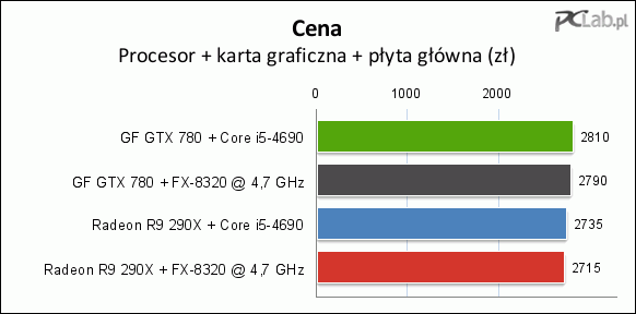 Nasz poprzedni test zestawów komputerowych, przeprowadzony z użyciem procesorów Intel Core i5-4690 oraz AMD FX-8320 @ 4,7 GHz i kart graficznych GeForce GTX 780 oraz Radeon R9 290, szybko się zdezaktualizował ze względu na obniżki cen ogłoszone pod koniec zeszłego tygodnia przez AMD. Ceny między innymi Radeonów R9 290 oraz R9 290X spadły w ciągu kilku dni o przeszło 100 zł, co sprawiło, że Radeony R9 290 już nie rywalizują bezpośrednio z GeForce'ami GTX 780. Nowym przeciwnikiem „zielonych” w tym segmencie (1700–1800 zł) jest Radeon R9 290X, a więc robi się ciekawie, przede wszystkim dla kupujących. Co prawda w cenie 1700 zł Radeony R9 290X można obecnie kupić tylko w jednym sklepie, ale zapewniono nas, że również inne zaoferują te karty za mniej niż 1800 zł. Dlatego do porównań przyjęliśmy cenę 1700 zł.