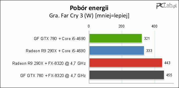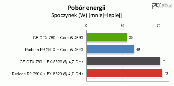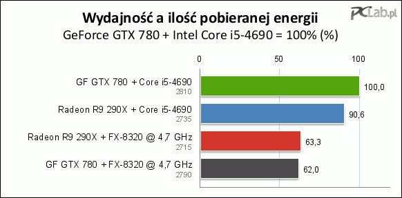Także pod względem poboru energii Radeon R9 290X wypada gorzej od R9 290. Nieznacznie lepsza wydajność jest okupiona zauważalnie większym zapotrzebowaniem na energię elektryczną. GeForce GTX 780 osiąga jednak porównywalne rezultaty. Najwięcej traci za to w tym rankingu AMD FX, który zapewnia sporo gorszą wydajność przy znacząco większym zapotrzebowaniu na energię.