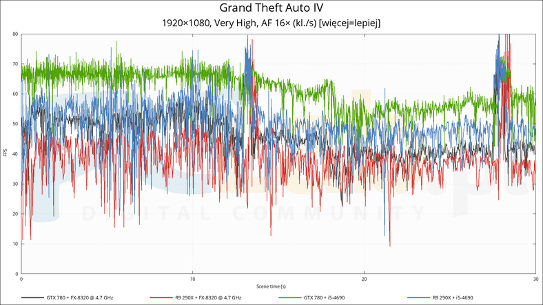 Płynność animacji w konfiguracjach z procesorem AMD FX jest znacznie niższa. Zestaw składający się z komponentów AMD oferuje średnią 35 kl./s, co dla tej gry z punktu widzenia wymagających graczy jest niewystarczające. GeForce GTX 780 niezależnie od wykorzystanego procesora oferuje znacznie wyższą wydajność.
