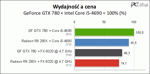 Wnioski dotyczące wpływu sterowników graficznych na wydajność pozostają te same. Rozwiniemy je na sam koniec. Teraz pora na zestawienie przedstawiające stosunek osiągów całych konfiguracji do ich cen. Radeon R9 290X jest zdecydowanie mniej opłacalnym wyborem od R9 290. Za dodatkowe 200 zł dostajemy raptem o 2% większą liczbę klatek na sekundę (średnio – z wykorzystaniem użytego przez nas procesora). Trudno się więc dziwić, że Radeon R9 290X okazał się też sporo mniej opłacalny od GeForce'a GTX 780.